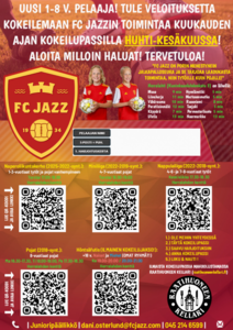 UUSI PELAAJA! TULE VELOITUKSETTA KOKEILEMAAN FC JAZZIN TOIMINTAA KUUKAUDEN AJAN HUHTIKUU-KESÄKUU VÄLISENÄ AIKANA KOKEILUPASSILLA! KOKEILUPASSI ON VOIMASSA KAIKILLE 1-8-VUOTIAAILLE UUSILLE HARRASTAJILLE!