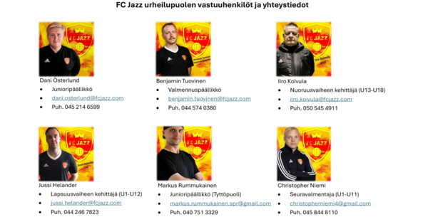 FC Jazz juniorit ikäluokkien päävalmentajat ja yhteystiedot: