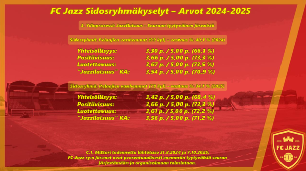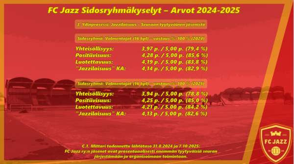 FC Jazzin sidosryhmäkyselyt teetettiin kauden 2025 lopulla elo-lokakuun aikaikkunassa seuran omalle jäsenistölleen kattaen aina seuran pelaajien vanhemmat, valmentajat, joukkueenjohtajat ja seuran työntekijät.