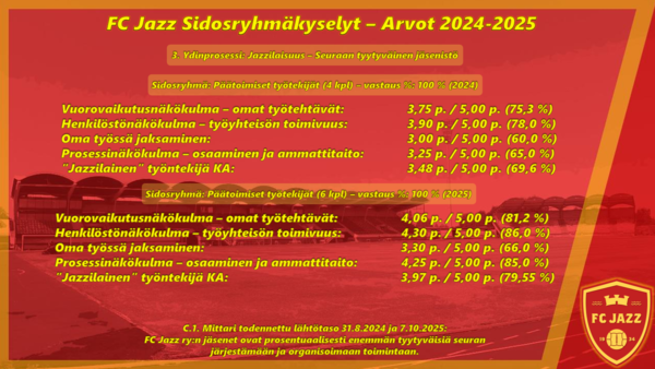 79,55 % päätoimisista työntekijöistä on viime kauden perusteella ollut enemmän tyytyväisempiä, kuin tyytymättömämpiä seuran toimintaan. Kauden 2025 perusteella verrattaessa kauteen 2024 on päätoimisten työntekijöiden sidosryhmän osalta tullut huomattavaa kasvua kokonaisuudessaan ”Jazzilaisuuden” osalta ja nousua lähes 10,00 %. Vapaan palautteen perusteella päätoimiset työntekijät kokevat, että työyhteisön toimivuus on ottanut isoja askelia oikeaan suuntaan, sekä omien työtehtävien laadukas suorittaminen on huomattavasti mahdollisempaa kuin edellisinä vuosina, mikä juontanut juurensa heidän paremmasta johtamisesta. Myös palkkojen maksaminen ajallaan päätoimisille työntekijöille seuran toimesta on saanut kiitosta. Palautteen perusteella pääsääntöisesti ”Jazzilainen” työntekijä voi ja jaksaa paremmin, sekä oma osaaminen ja ammattitaito on kehittynyt edellisistä vuosista, jolloin työntekijän oma työpanos mahdollistaa omissa työtehtävissä paremmin onnistumisen ja tuloksen tekemisen koko seurayhteisön hyväksi.